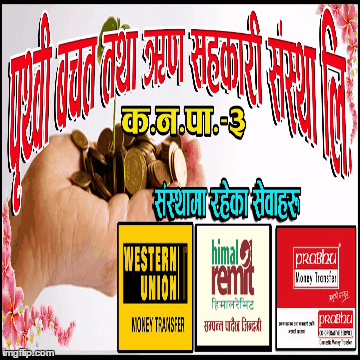 In the Contest of Competitive Market due to government's Liberal and free economic Policy along with the pace of technological entrancement, our entrepreneurs are facing number of threats development on the belief of "Today's Saving is tomorrow's ornaments" . Co-operative play on vital role in the economic development of the country. It is the backbone and third pole of economic development of every country so, Prithivi Saving and Credit Co-operative has been Providing Strong financial Support to those remote people who are keeping interested to raise their life style with their Creativity. Prithivi Saving and Credit Co-operative is always there to serve you people.